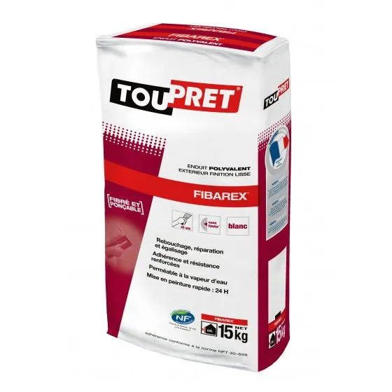 ENDUIT POLYVALENT, FINITION - FIBAREX - POUDRE 15 KG Enduit de rebouchage et de réparation fibré en poudre, extérieur, pour application manuelle. Adhérence et résistance renforcées. Perméable à la vapeur d'eau. Mise en peinture rapide : 24H. S'applique sur supports neufs ou rénovés, bruts ou peints (plâtre, anciens fonds peints, ciment, pâtes de verre, céramique..).