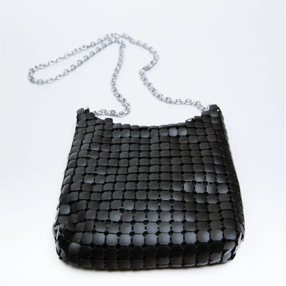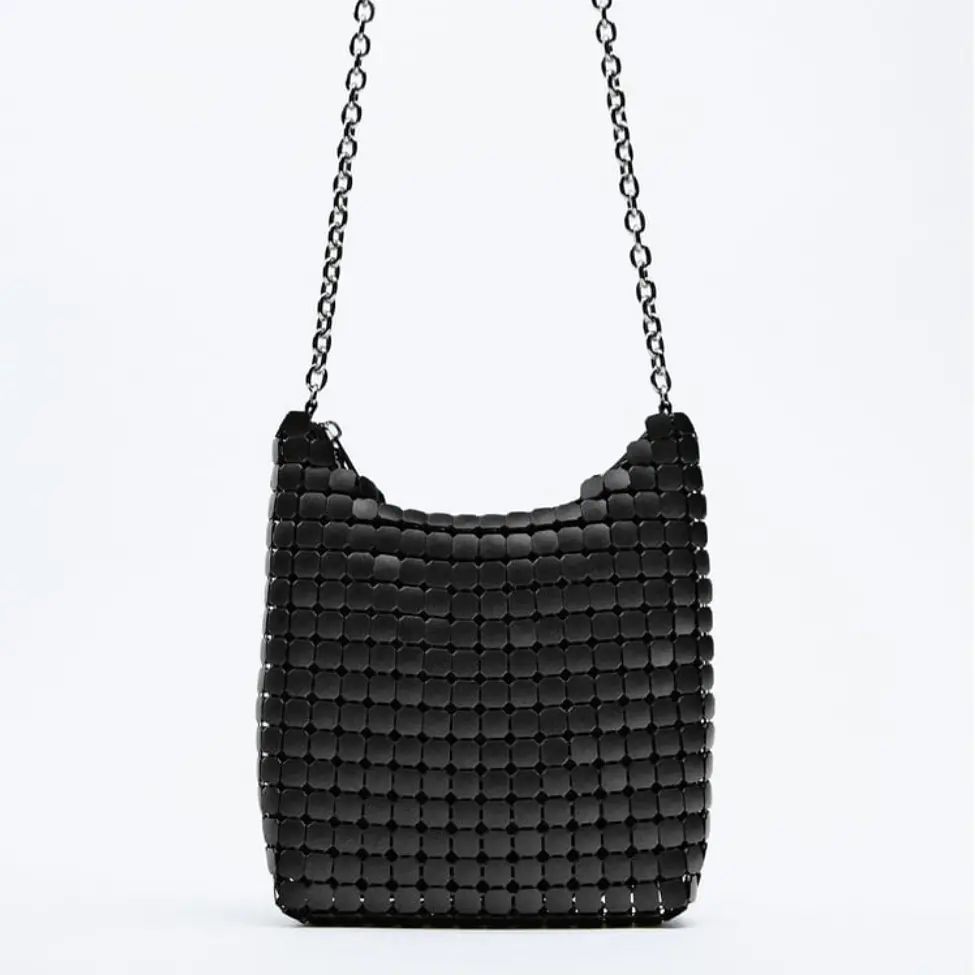 SAC BANDOULIÈRE AVEC PARTIE PRINCIPALE MÉTALLIQUE. DOUBLURE AVEC POCHE. POIGNÉE ET BANDOULIÈRE EN CHAÎNE. FERMETURE ZIPPÉE.